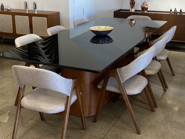Mesa * MONTREAL * com tampo de vidro preto, coluna em madeira maciça