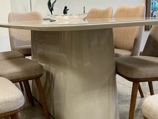 Mesa * FLÓRIDA * com tampo de vidro, no Off White, coluna em madeira pintada no Off (opcional na cor imbuia e mel)